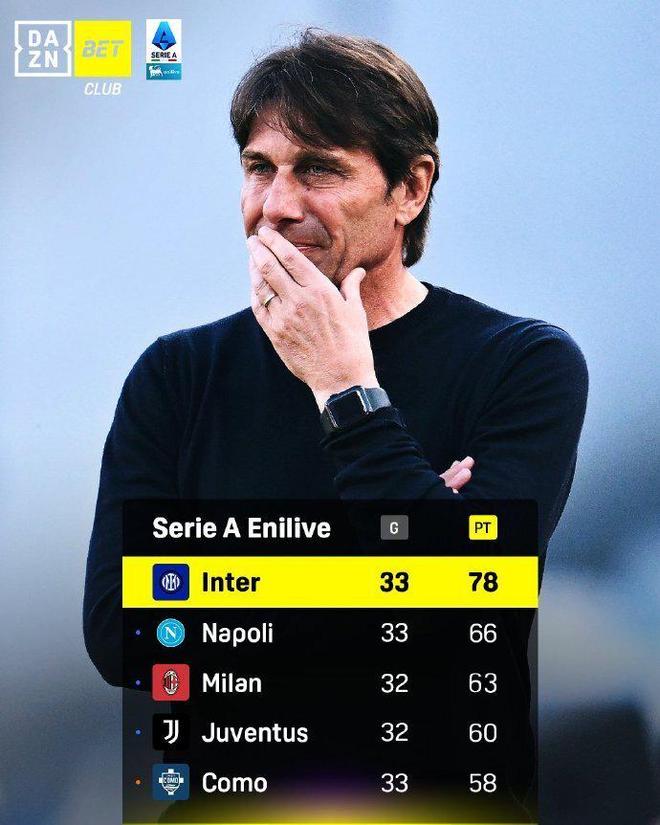 按照规则,意甲争冠,如果同分需要打附加赛。因此在排除这个情况的前提下,国米在第34轮只要拿分比那不勒斯更多,就可以提前夺冠。